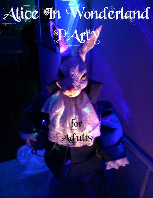 Once you went down the rabbit hole (the front door) you entered a magical place of music, lights and mood. The rabbit greeted you in the entry way with custom specialty drinks on the left. It was really blue and dark when you came inside, but I lightened the picture so you could see the rabbit and setup on the table. Tables and chairs were set up in the living room with fabric lining the ceiling and paper flowers hanging from the ceiling. Notice the giant mushroom. Some whimsy with the adult nightclub scene. Each table had a different bright colored satin table cloth. One could very easily buy different satin fabrics from a fabric store and do the same.